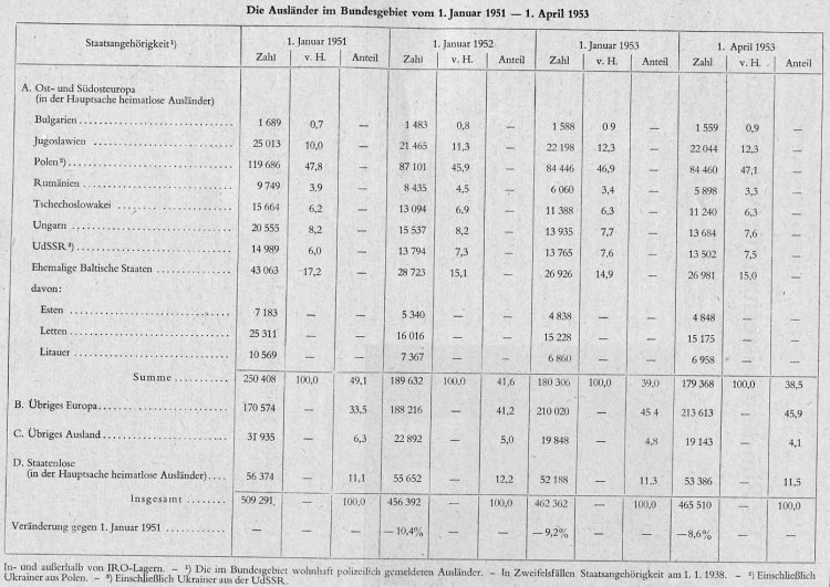 Die Eingliederung der heimatlosen Ausländer und der ausländischen Flüchtlinge in das deutsche Wirt­schaftsleben vollzieht sich langsam. Ihre Verteilung auf die einzelnen Bundesländer erfolgt auf Grund der Verordnung über Anerkennung und Verteilung aus­ländischer Flüchtlinge vom 6. Januar 1953. Der Ver­teilungsschlüssel wurde am 23. Januar 1953 vom Bun­desrat festgelegt und ist für ein Jahr gültig. Die Über­nahme der heimatlosen Ausländer in die Länder ist wie folgt geregelt: