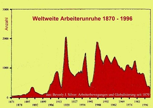 "Zusammenfassend können wir festhalten, dass die Gesamtdynamik der weltweiten Arbeiterunruhe in den Auf- und Abstieg von Produktzyklen eingebettet ist, die mit Veränderungen im Ausmaß und Charakter der Arbeitermacht einhergehen." (Silver: 126.)