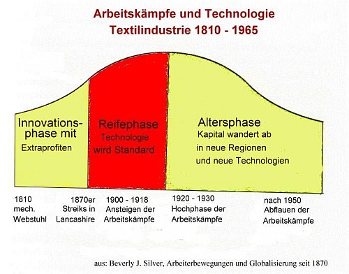 "Anfang der zwanziger Jahre (des 20. Jh.) hatte diese Globalisierung der mechanisierten Textilproduktion weltweit einen enormen Wettbewerbsdruck erzeugt. ... Die Textilunternehmer (versuchten) die Produktion zu rationalisieren und die Kosten zu senken. Das löste in den zwanziger und dreißiger Jahren wiederum eine weltweite Welle von Arbeiterunruhen aus. ... Die Schauplätze gewaltiger Streikbewegungen reichten von Manchester bis nach Bombay, Gastonia (North Carolina, USA) und Shanghai." (Silver: 117).