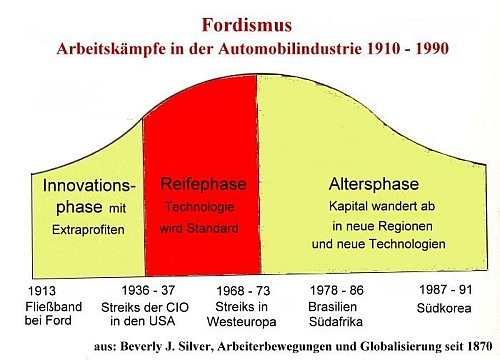 "Eine große Welle von Arbeiterunruhen ist in jeder neuen Phase von Produktionsverlagerungen einer der 'push'-Faktoren, die wiederum eine neue Runde der Klassenbildung auslösen. ... Die Innovationsphase des Automobil-Lebenszyklus (stieß) mit den CIO-Kämpfen in den USA an ihre Grenzen. Die Grenzen der zweiten, der Reifephase wurden mit der Welle von Arbeiterunruhen in Europa am Ende der sechziger und in den siebziger Jahren erreicht, und das Ende der dritten Phase, der Standardisierung, zeichnet sich mit den vielfältigen Schüben von Arbeitermilitanz in den Schwellenländern in den achtziger und neunziger Jahren ab." (Silver: 104.)