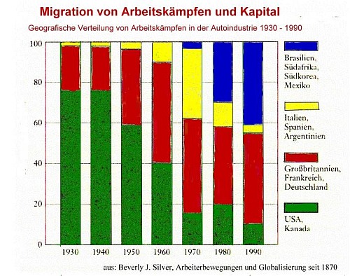 "Die Kapitalabwanderung untergrub die Arbeitermacht an bisherigen Produktionsstandorten, gleichzeitig wurden aber an den neuen Orten industrieller Ausweitung neue Arbeiterklassen geschaffen. Im Ergebnis haben sich zwischen den dreißiger und neunziger Jahren nicht nur die Techniken der Massenproduktion von Automobilen von den USA über Westeuropa bis hin zu einer Gruppe rasch industrialisierter Schwellenländer verbreitet, sondern auch eine charakteristische Form der Arbeitermilitanz." (Silver: 69).