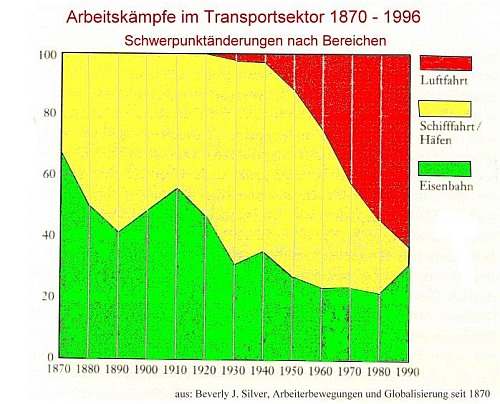 Arbeitskämpfe im Transportwesen bilden einen überproportionalen Anteil aller Arbeitskämpfe: "im Durchschnitt 35 Prozent aller industriespezifischen Nennungen von 1870 bis 1996. Damit bilden die Arbeiterunruhen im Transportsektor die größte Kategorie. Sie liegt sogar vor der verarbeitenden Industrie (21 Prozent) und dem Bergbau (18 Prozent)." (Silver: 127.)