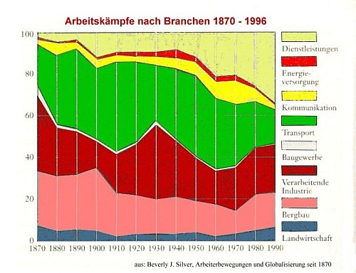 "Die Arbeiterunruhen verlagern sich ... nicht nur innerhalb eines bestimmten Sektors von einem Ort zum anderen, sondern mit dem Aufstieg und Niedergang führender Sektoren der kapitalistischen Entwicklung wechseln auch die Hauptschauplätze von Klassenbildung und Protest von einem Sektor zum anderen."