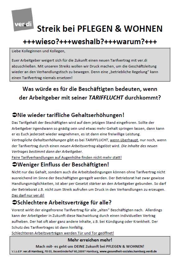 Am dritten zentralen Warnstreiktag am  24.1.2012  machten die rund 200 Streikenden von PFLEGEN & WOHNEN eine Demonstration durch die Hamburger Innenstadt. Sie informierten damit die BürgerInnen, dass sie angemessene Bezahlung und Arbeitsbedingungen verlangen, die in einem Tarifvertrag festgeschrieben sind. Das nachstehende Flugblatt wurde dort verteilt.