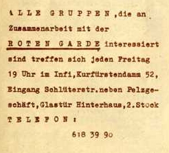 Vorderseite des Flugis vom Januar 1968Im Laufes des Jahres sollte das "Aktionszentrum der Schüler" am westberliner "Ku-Damm" der Organisationssitz der maoistischen Gruppe "Rote Garde Berlin" werden, die später im "INFI" tagte.