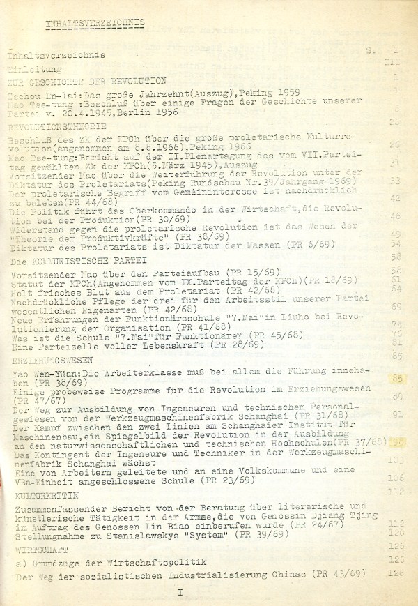 Inhaltsverzeichnis des Schulungshefts zur chinesischen Kulturrevolution