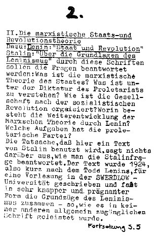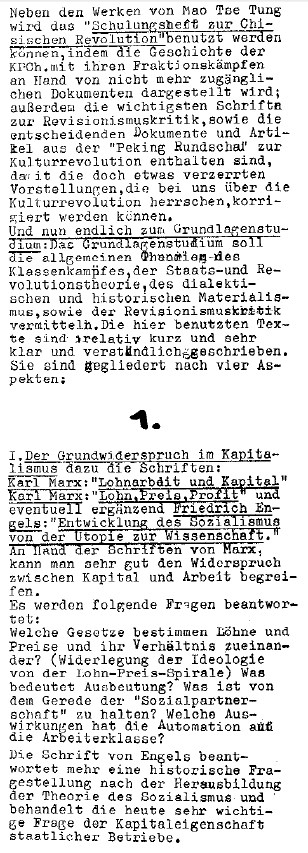 des Proletarierinnenzentrums - Marxistisch-leninistische Fraktion (Proz-ML)...Die Grundschulung, zu der wir in unserer Agitation und Propaganda die Proletarierinnen motivieren wollen, wird der erste Schritt zu ihrer Organisierung sein. Warum? Weil sie dieselbe sein muß für alle Parteiungen des Proletariats. Sie muß einheitlich sein und zentral organisiert. Die Grundschulung wird durchgeführt an klassischen Texten, die von Marx über Lenin bis Mao eine einheitliche politische Linie aufweisen. Es geht darum, die Prinzipien dieser Linie sich anzueignen, sie zu instrumentalisieren für den Kampf des deutschen Proletariats. Nur auf diese Weise wird das Proletariat die seinem Kampf angemessene, aus ihm entwickelte und ihn weitertreibende Theorie als eine seiner Waffen bilden können. Welches sind die Prinzipien, die bei der Aufarbeitung der Kampferfahrungen dem deutschen Proletariat als Kriterien dienen können?