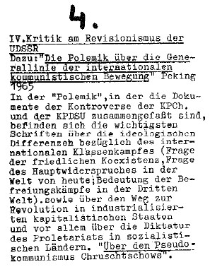 Kampf dem Revisionismus als Prüfstein der ersten drei Prinzipien. In der Aufbauschulung wird von den Kadern das erarbeitet werden, was Inhalt der Agitation und Propaganda sein wird. Es wird geleistet werden müssen eine kommunistische Kritik an den revisionistischen Parteien; zweitens das Studium der Geschichte der Arbeiterbewegung, um aus ihren Fehlern und aus ihren Siegen zu lernen; drittens das Studium der Geschichte der Organisierung der Proletarierinnen, die Analyse des internationalen glorreichen Kampfes der Frauen der unterdrückten Völker, das Studium der matriarchalischen Gesellschaft...