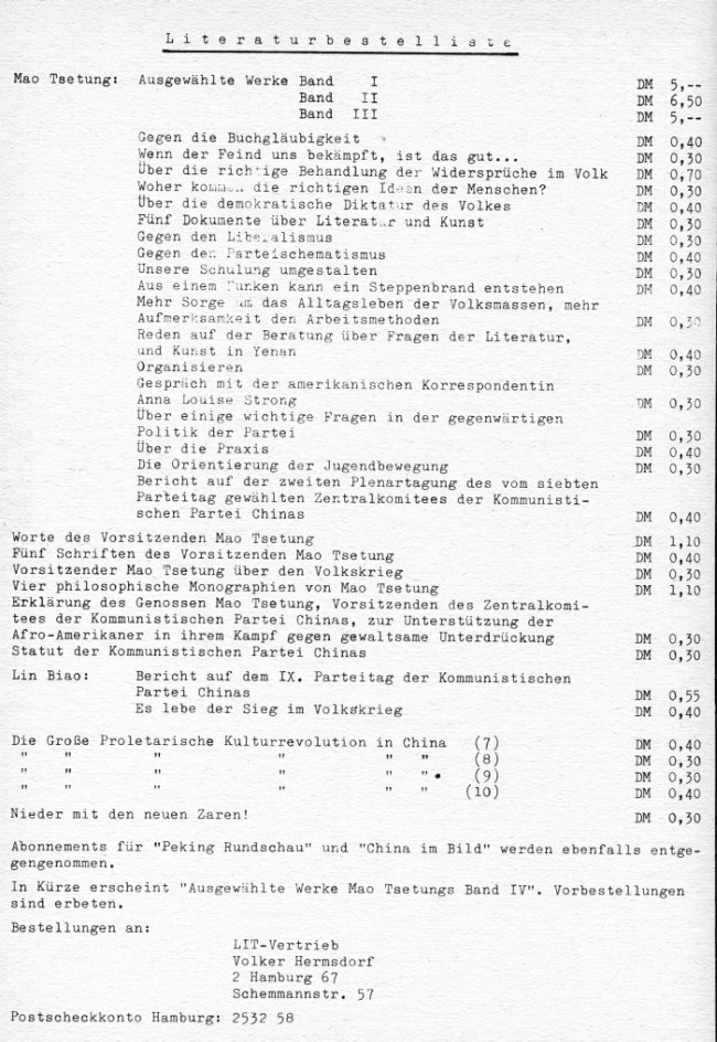 Klaus Wagenbach, der 1967 auf einer Vollversammlung des Buchhändler-Börsenvereins als "Maoist" beschimpft worden war, bringt in einer neuen Reihe "Rotbücher" im Herbst 1968 erstmalig selber Texte von Mao Tse-tung heraus: "Über den Widerspruch", einen Aufsatz Maos von 1937, kommentiert von Christian Semler.