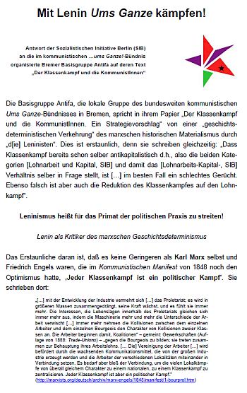 Antwort der Sozialistischen Initiative Berlin (SIB) an die im kommunistischen …ums Ganze!-Bündnisorganisierte Bremer Basisgruppe Antifa auf deren Text„Der Klassenkampf und die KommunistInnen“
