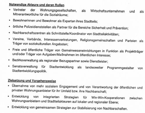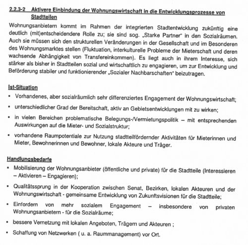 Beim genaueren Nachprüfen dieser Forderungen zeigt sich jedoch, dass es sich keineswegs um einen Mieterschutz handelt, sondern um ein um bestimmte Forderungen (z.B. Bundesratsinitiative) erweitertes Plagiat; nämlich dem so genannten Interessenausgleich nach dem "win-win-Prinzip" zwischen dem Wohnungskapital und den als "Akteuren" chiffrierten MieterInnen, wie er im Ergebnisbericht März 2008 zur Rahmenstrategie "Soziale Stadtentwicklung" des rot-roten Senats beschrieben ist.