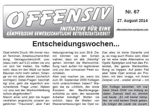 Diesmal: "Offensiv" Initiative für eine kämpferische und  gewerkschaftliche Betriebsratsarbeit Nr. 67 vom 27.8.2014