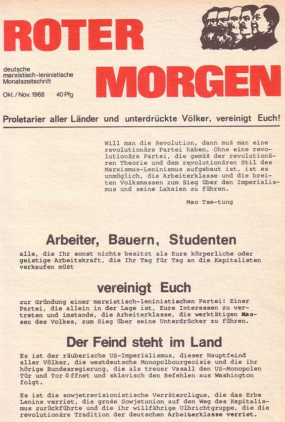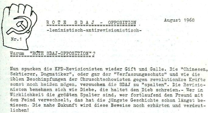Anläßlich des Einmarsches der Warschauer Pakt-Truppen in die CSSR am 21.8.1968 entstand in Mannheim im Zusammenhang mit der Spaltung der dortigen Gruppe der Sozialistischen Deutschen Arbeiterjugend (SDAJ), der Jugendorganisation der künftigen DKP, eine Gruppe, die sich "Revolutionäre Jugend (ML)" nannte und ein Organ unter dem Titel "Rote SDAJ-Opposition" herausgab, deren erste Nummer noch im August 1968 erschien.