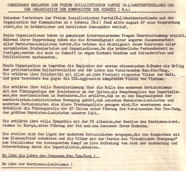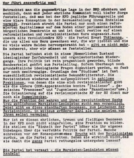 2) Diese Gruppe wird hier nicht weiter gehandelt, da es sich um eine trotzkistisch-grundierte Strömung von ehemaligen Sozialdemokraten handelte. Siehe dazu ihr "Manifest einer neuen sozialistischen Partei" im MAO-Archiv)