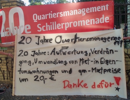 Heute will sich das Quartiersmanagement Schillerpromenade mit einer Ausstellung feiern und “erfolgreiche“ Arbeit dokumentieren. Ja, leider war sie erfolgreich im Sinne der Aufwertung des Kiezes für die Mittelschicht und die Vertreibung unerwünschter Armer. Die Zahl der Bewohner hat sich erhöht, es sind zu 90% Akademiker hinzugezogen und arme Migranten aus ostwärts gelegenen Ländern mussten gehen. Die Mieten haben sich in den letzten 10 Jahren verdoppelt, Immobilienfirmen bringen immer mehr Häuser in ihren Besitz, immer mehr Wohnungen werden in Eigentumswohnungen umgewandelt und Mieterinnen mit Eigenbedarfsforderungen bedroht.