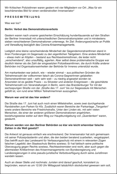 Berlin am 29.8.2020: Verbot des DemonstrationsverbotsPressemitteilung von "Kritische PolizistInnen"