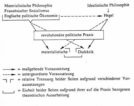 VORAUSSETZUNGEN VON MARX - MARX ALS VORAUSSETZUNGDie Geschichte des materialistisch-dialektischen Denkens bildet keine einfache einlinige Entwicklung. Sie weist zahlreiche Verzweigungen auf; und es gibt keine verbindliche Festlegung darüber, welches die hauptsächliche, auch für die Zukunft maßgebende Entwicklungslinie ist. Karl Marx^ Friedrich Engels und die daran anschließenden theoretischen Konzeptionen haben eine Vielzahl eigenständiger Modelle des materialistisch-dialektischen Denkens hervorgebracht. Das grundlegende Modell ist zweifellos im Rahmen der Marxschen Theorie entwickelt worden, auf das sich Engels und die folgenden marxistischen Philosophen immer wieder zurückbeziehen. Die Position von Marx bildet eine entscheidende Voraussetzung für die späteren materialistischen Dialektik-Modelle.