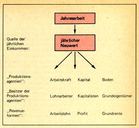 „Der durch die jährlich neu zugesetzte Arbeit neu zugesetzte Wert - also auch der Teil des jährlichen Produkts, worin sich dieser Wert darstellt, und der aus dem Gesamtertrag herausgezogen, ausgeschieden werden kann - zerfällt also in drei Teile, die drei verschiedne Revenueformen annehmen, in Formen, die einen Teil dieses Werts als dem Besitzer der Arbeitskraft, einen Teil als dem Besitzer des Kapitals, und einen dritten Teil als dem Besitzer des Grundeigentums gehörig oder zufallend ausdrücken. Es sind dies also Verhältnisse oder Formen der Distribution, denn sie drücken die Verhältnisse aus, worin sich der neu erzeugte Gesamtwert unter die Besitzer der verschiednen Produktionsagenten verteilt. Der gewöhnlichen Anschauung erscheinen diese Verteilungsverhältnisse als Naturverhältnisse, als Verhältnisse, die aus der Natur aller gesellschaftlichen Produktion, aus den Gesetzen der menschlichen Produktion schlechthin entspringen." (MEW, Bd. 25, S. 884)