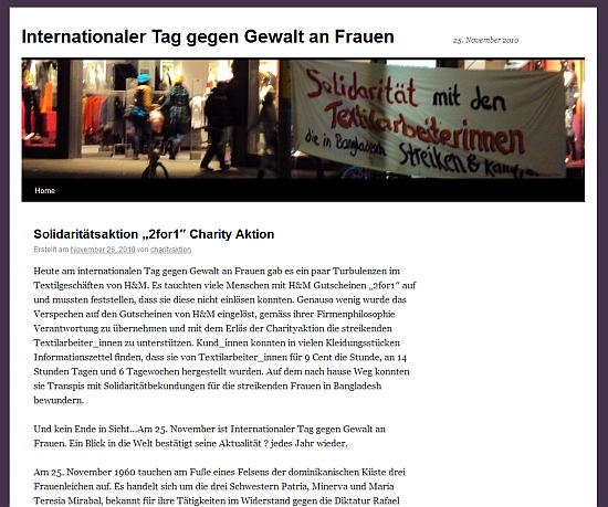 onlinezeitungHeute am internationalen Tag gegen Gewalt an Frauen gab es ein paar Turbulenzen im Textilgeschäften von H&M. Es tauchten viele Menschen mit H&M Gutscheinen „2for1″ auf und mussten feststellen, dass sie diese nicht einlösen konnten. Genauso wenig wurde das Verspechen auf den Gutscheinen von H&M eingelöst, gemäss ihrer Firmenphilosophie Verantwortung zu übernehmen und mit dem Erlös der Charityaktion die streikenden Textilarbeiter_innen zu unterstützen.