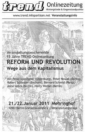 Wie müsste HEUTE so eine revolutionäre Organisation aussehen? In welchem Verhältnis stünde sie zum Proletariat? Entsteht sie in den Kämpfen der Klasse? Was wären ihre programmatischen Grundlagen? Wie wären die Tageskämpfe mit dem Kampf für eine menschwürdige Gesellschaft jenseits des Kapitalismus zu verbinden? Welche Strukturen müsste diese Organisation haben? Was gäbe es aus den Fehlern und Niederlagen der Vergangenheit zu lernen? Was sollte sich nicht wiederholen? Was hieße HEUTE Reform und was Revolution. Hieße die Antwort nach wie vor: Diktatur des Proletariats?Freitag, den 21. 1. 2011 - 19.30 Uhr