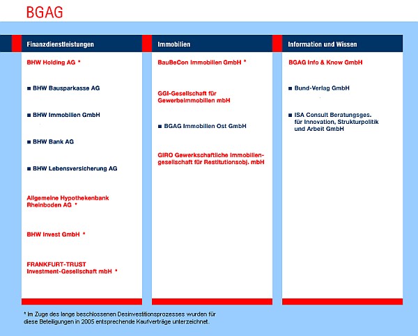 Die BGAG war unter der Leitung von Hans Matthöfer führend an der 1986/87 beginnenden Abwicklung/Zerschlagung der Gewerkschaftsunternehmen beteiligt. Anschaulich nachzulesen bei: Peter Kramper, Das Ende der Gemeinwirtschaft, in: Archiv für Sozialgeschichte 52, 2012