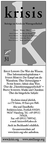 Lohoff, Ernst (2007): Der Wert des Wissens. Grundlagen einer Politischen Ökonomie des Informationskapitalismus, in krisis 31; Münster: Unrast.