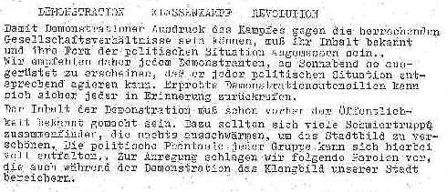 Der Inhalt der Demonstration muß schon vorher der Öffentlichkeit bekannt gemacht sein. Dazu sollten sich viele Schmiertrupps zusammenfinden, die nachts ausschwärmen, um das Stadtbild zu verschönen. Die politische Phantasie jeder Gruppe kann sich hierbei voll entfalten.. Zur Anregung schlagen wir folgende Parolen vor, die auch während der Demonstration das Klangbild unserer Stadt bereichern. GEGEN SOZIALDEMOKRATISMUS - FÜR ARBEITERKONTROLLE UND ARBEITERMACHT Die Sozialdemokratie ist nichts als ein stinkender Leichnam Rosa Wer hat uns verraten - Sozialdemokraten Einer muß der Bluthund sein Wir brauchen nicht nur den Arbeitsplatz Die Kapitalisten brauchen euch - ihr braucht sie nicht
