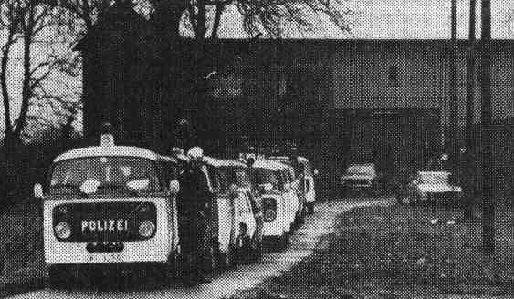 - Am Freitagmorgen, 18. 2. 77, wurde von der Polizei am Tor der Kaserne eine Straßensperre errichtet (d.h., an der B 5). Hier wurde jedes Auto kontrolliert. Die Autonummern wurden mit Funk zu einem zentralen Computer durchgegeben, wo innerhalb von 45 Sekunden der Fahrzeughalter ermittelt werden kann. Falls bekannte Funktionäre von "K-Gruppen" durchkommen oder von Bürgerinitiativen, sollten sie festgehalten werden.