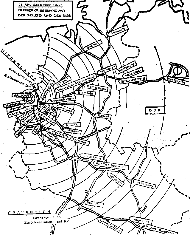 Die Karte zeigt Sperr- und Kontrollstellen sowie Zurückweisungen an den Autobahnen Richtung Kalkar, denen Zehntausende von BürgerInnen unterworfen waren. Auch Züge wurden angehalten. So z.B. wurde ein Linienzug von Duisburg nach Kalkar unter Einsatz von Hubschraubern gestoppt.