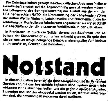 Die außerparlamentarische Opposition, dieser Block aus SDS, Gewerkschaftslinken, KommunistInnen, SchülerInnengruppen, Falken u.a. - kurz die APO machte im Frühjahr 1968 den Kampf gegen die Verabschiedung "NS-Gesetze" im Bundestag zum Focus ihres Kampfes um eine grundlegende Veränderung der BRD. Zehntausende fuhren am 11. Mai, vor der 2. Lesung, zum Sternmarsch nach Bonn. In der Folgezeit kam es zu Besetzungen an etlichen Universitäten als Ausdruck des Widerstandes. Das Ziel: Generalstreik zur 3. Lesung am 29. Mai 1968, wurde jedoch kläglich verfehlt. Die BRD war eben nicht Frankreich. Die NS-Gesetze wurden wirksam und die APO zerfiel in Strömungen und Gruppen, bis sie sich schließlich an der Jahreswende 1969/70 in zig K-Gruppen auflöste. | ||